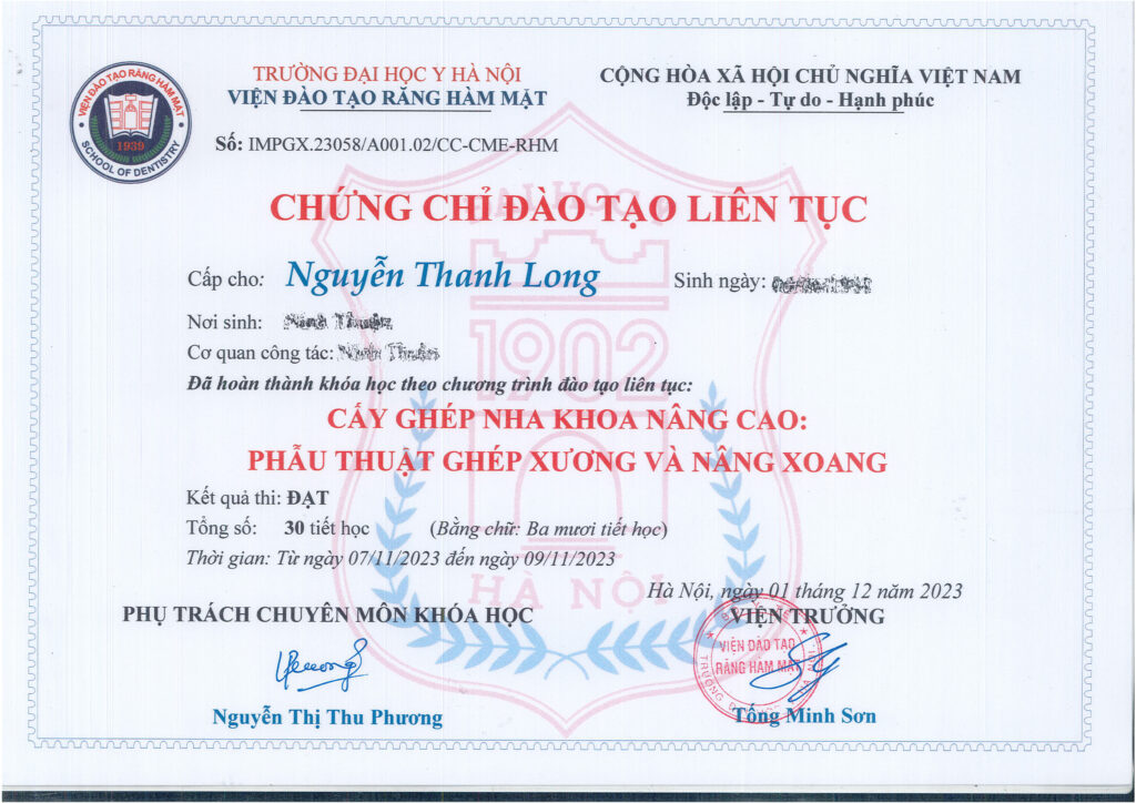 - Chứng chỉ Cấy ghép Implant nâng cao tại Đại Học Y Hà Nội