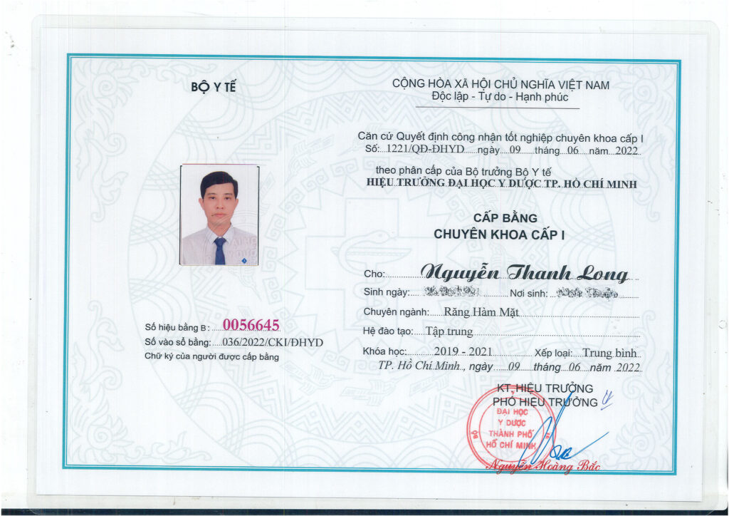 - Chứng chỉ điều trị nội nha và nhổ răng tiểu phẫu chuyên khoa I Đại học Y Dược Huế